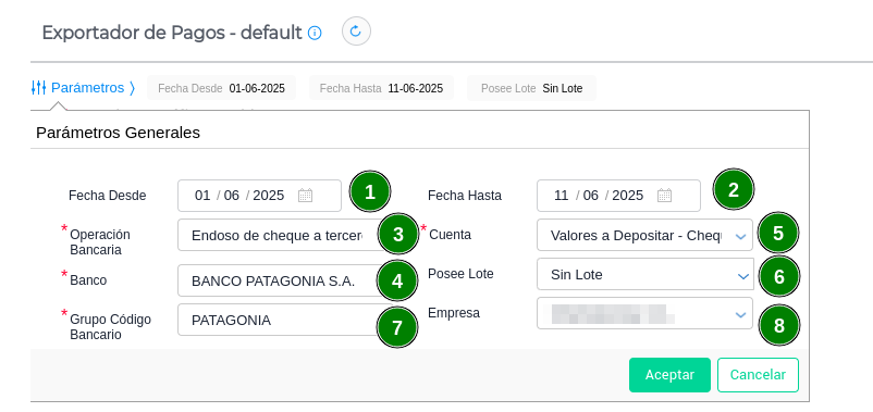 Una vez configurados: cuentas de banco, proveedores y códigos bancarios, podremos ingresar el ‘Exportador de Pagos’. Para la exportación de pagos efectuado por endoso de echeqs del banco Patagonia, completaremos: