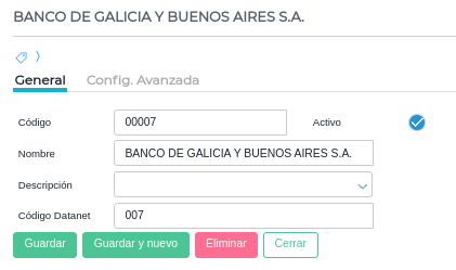 El sistema ya tiene precargados los bancos en este maestro. En caso de que no se encuentre el que necesitás utilizar, se puede dar de alta uno nuevo y completar: