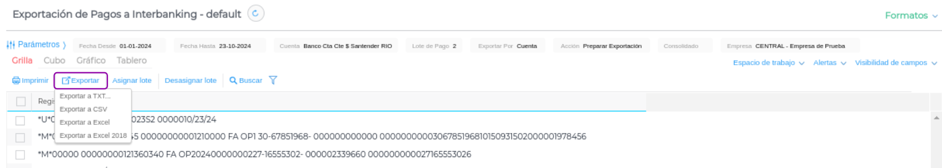 Ruta: Menú → Gestión empresarial → Tesorería → Otras exportaciones de pago a proveedores: Exportación de pagos a Interbanking.