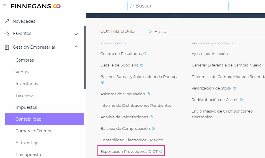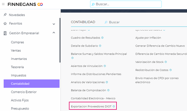 Desde el menú Gestión empresarial → Contabilidad → Exportación Proveedores DIOT