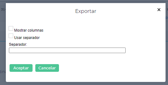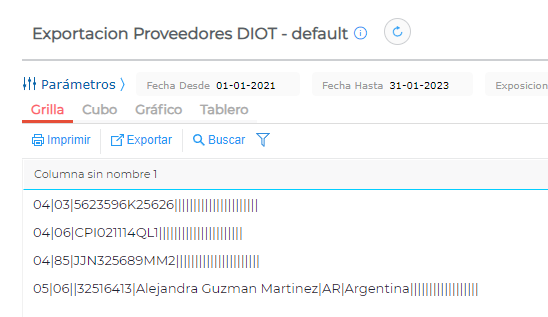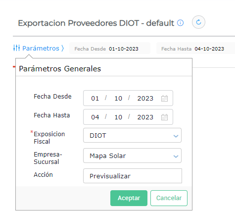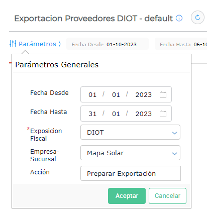 Para obtener el archivo a exportar, desde la misma información se debe seleccionar en los parámetros, en el campo Acción, la opción Preparar exportación.