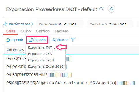 Luego, se presiona el botón Exportar y se selecciona la opción Exportar a TXT