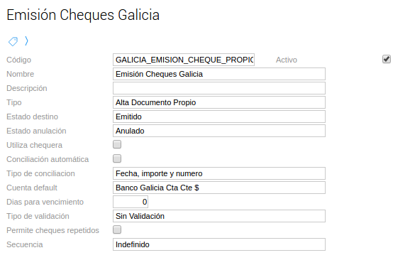 El código debe ser: GALICIA_EMISION_CHEQUE_PROPIO