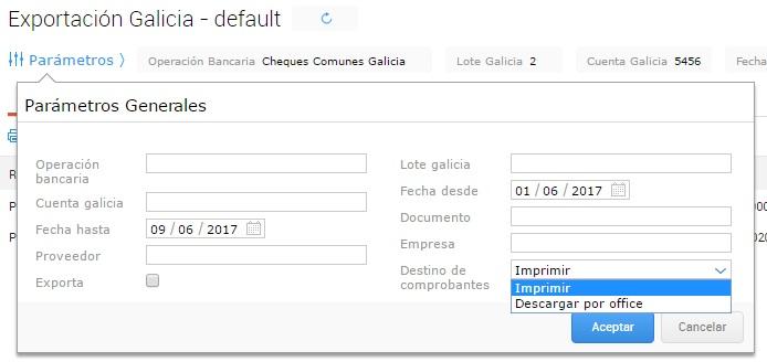 La funcionalidad permite exportar los pagos para presentar a la entidad bancaria Banco Galicia.