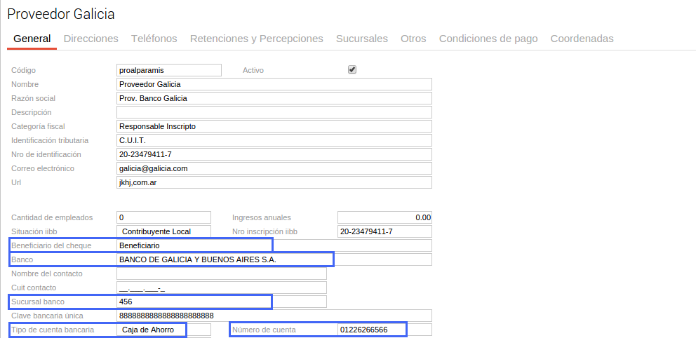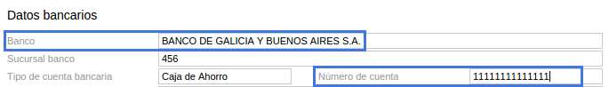 Para esto, en el maestro de Proveedores se debe indicar que el banco es el Galicia y el número de la cuenta.