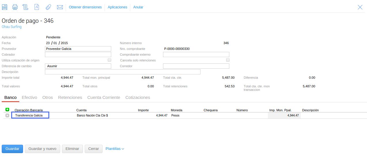 - Realizar una Orden de Pago seleccionando como medio de pago una de las Operaciones Bancarias mencionadas anteriormente.