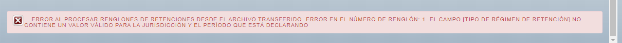 “El campo [TIPO DE RÉGIMEN DE RETENCIÓN] no contiene un valor válido para la jurisdicción y el período que está declarando”.