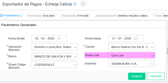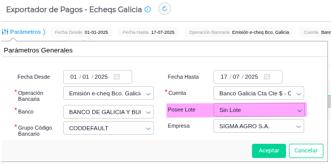 Si se desea consultar un lote para re-exportar o editar, modificar el parámetro y consultar “Posee Lote = Todos / Con Lote”.