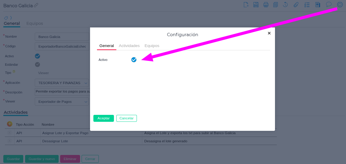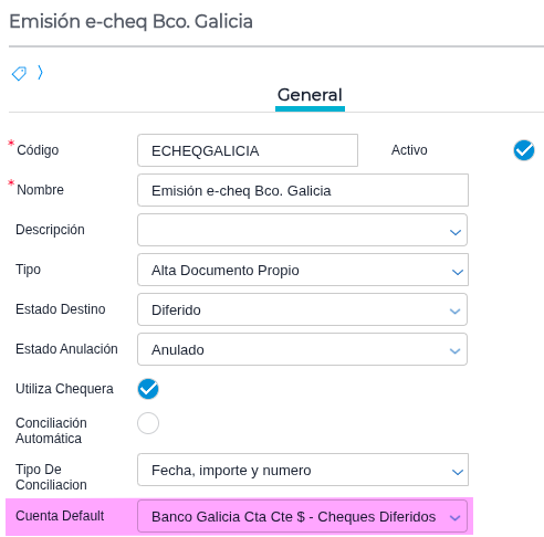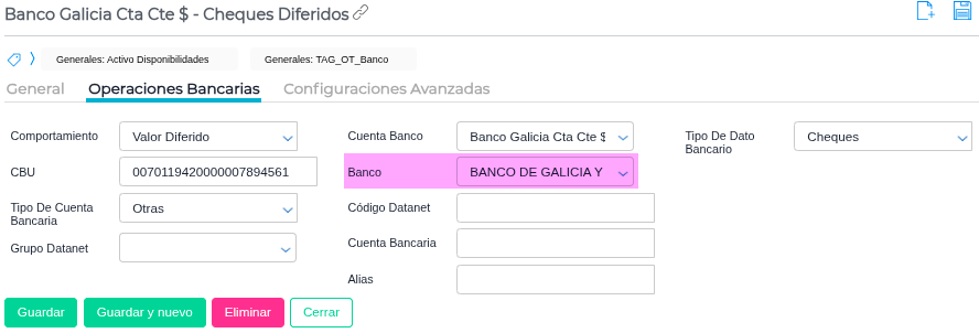 Configurar la cuenta contable de cheques diferidos, definir el Banco Galicia como banco asociado.