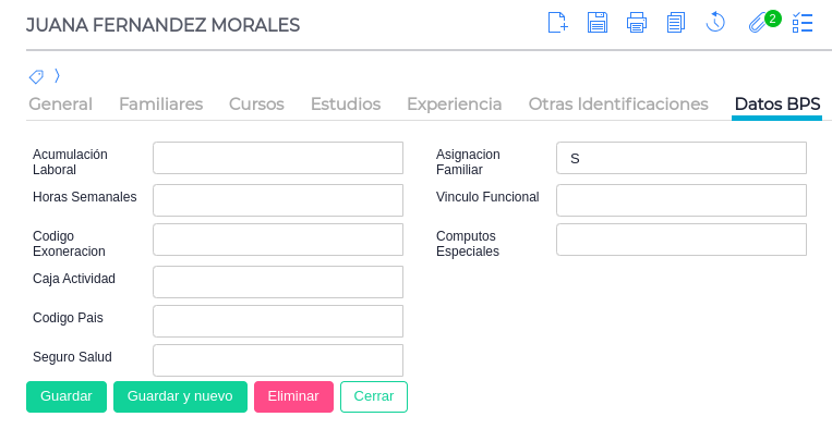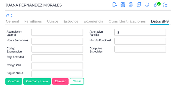 - Completar la solapa Datos BPS. Dentro de dicha columna se deben ingresar los códigos de cada campo asociados con el manual de BPS: Codificador para BPS
