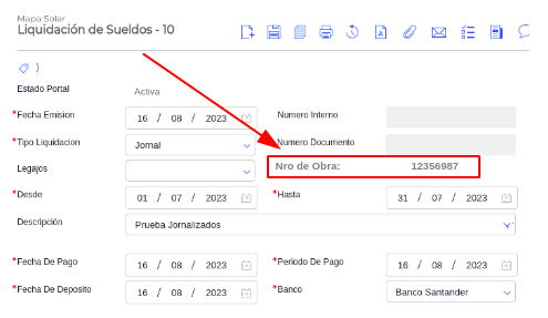 Si la empresa posee como tipo de actividad Construcción, se deberá ingresar el Nro de Obra asociado a los funcionarios que se liquidan.