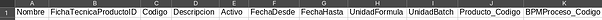 - BPMProceso_Codigo: Es el código del proceso productivo que usa la fórmula de producción. Campo Obligatorio.