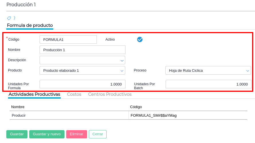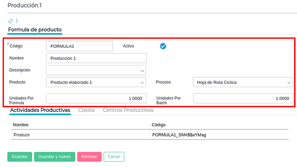 - Producto_Codigo: Es el código del producto que se está produciendo en la fórmula. Campo obligatorio.