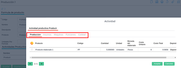 Esta etapa incluye la carga de las solapas de cada actividad que contenga el proceso productivo de la fórmula. Estas solapas son las de Producción, Insumos, Máquinas, Funciones y Calidad.
