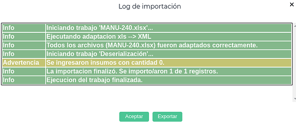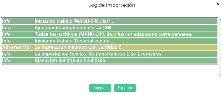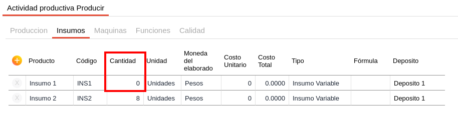 Es importante mencionar que se pueden ingresar insumos con cantidad cero (ya sea en forma manual o a través de la importación):