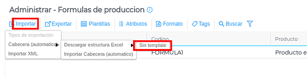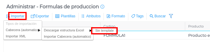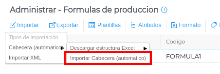 La importación de las fórmulas de producción estará dividida en dos etapas: la carga de la cabecera y la carga de las actividades.