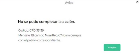 Al querer timbrar una factura de venta a un cliente del exterior se emite el siguiente mensaje: