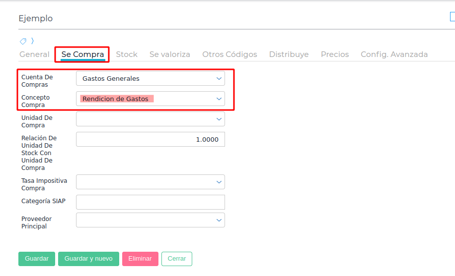 Ingresar al producto utilizado en la orden de compra y chequear en la solapa “Se Compra” los campos “Cuenta y Concepto”