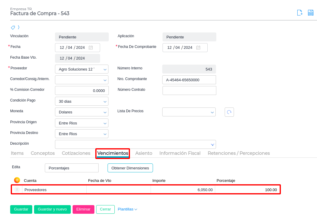 Para poder hacerlo, debemos desagregar la deuda parcialmente desde la factura, en la solapa de “vencimientos”. De esta manera, podremos cambiar la moneda solo de la parte que necesitemos.