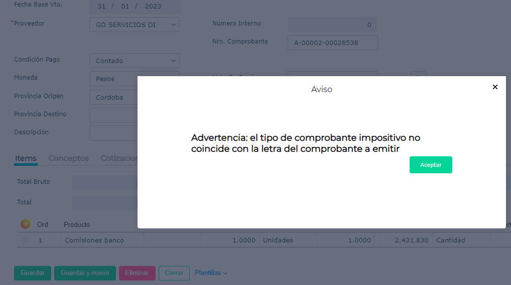 El sistema emite el mensaje de advertencia: “El tipo de comprobante impositivo no coincide con la letra del comprobante a emitir” a la hora de guardar una factura de compra.