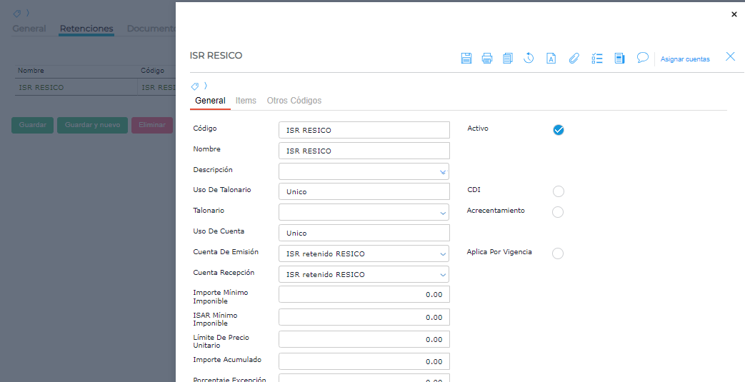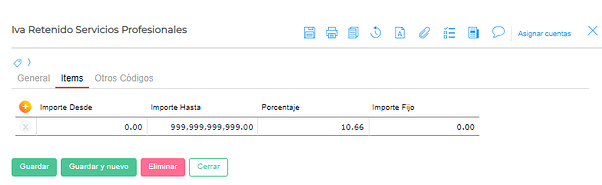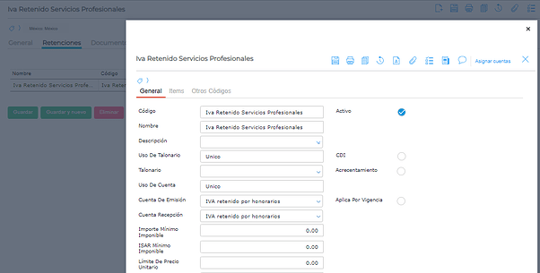 En la pestaña Items se indica el porcentaje de retención.