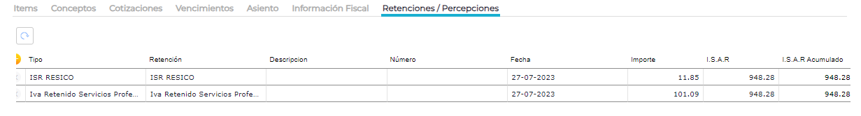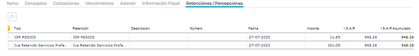 En la pestaña retenciones y percepciones se puede observar que el sistema calcula automáticamente las retenciones