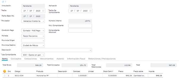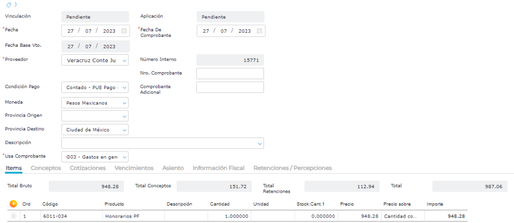 Al cargar la factura, una vez que se selecciona el proveedor y se indican los ítems, el sistema calcula automáticamente las 2 retenciones