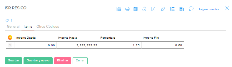 En la pestaña Retenciones, se debe agregar una retención donde se indicará el porcentaje del 1.25%