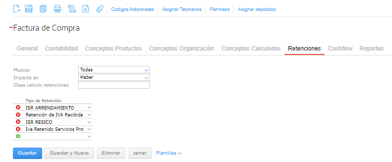 En el tipo de documento de Factura de compra, se deben agregar las retenciones previamente creadas