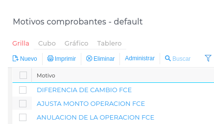 Ruta: Configuración > General > Más maestros > Motivos Comprobantes