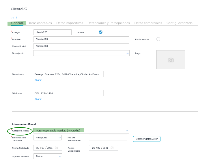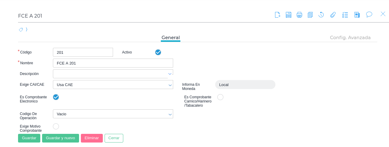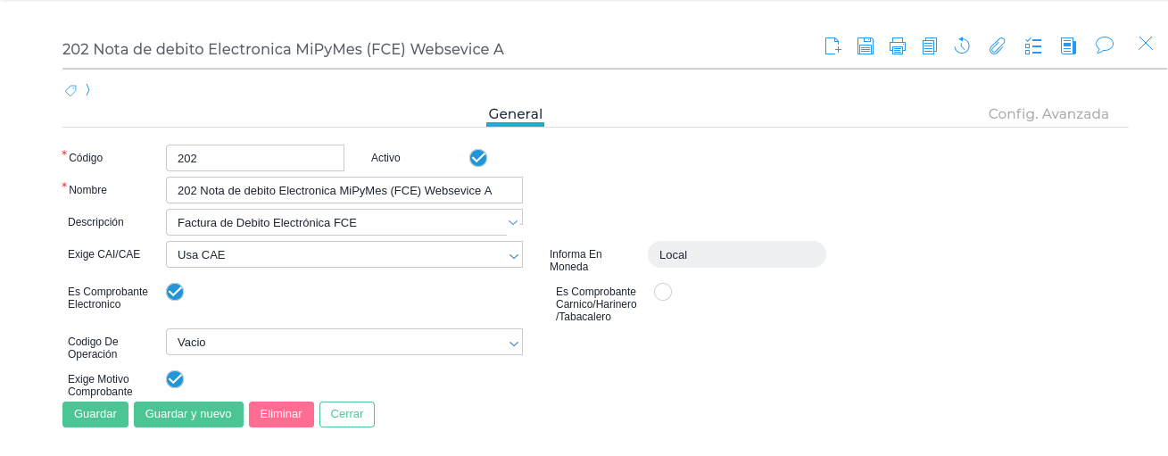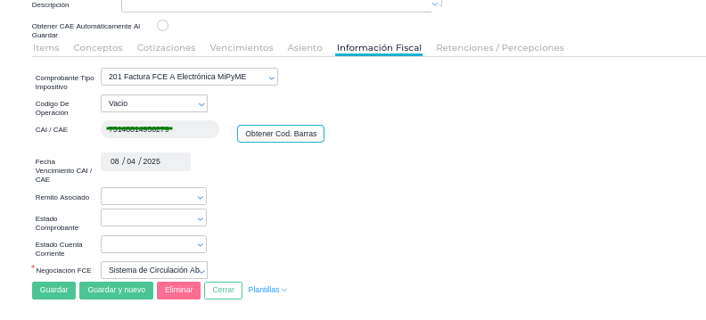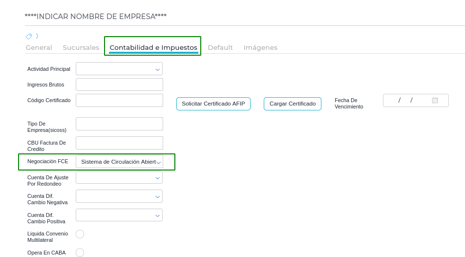 - Configurar en la empresa la negociación FCE si se desea negociar las facturas al agente de depósito colectivo (por caja de valores) o por el sistema de circulación abierta. Esta configuración es obligatoria para emitir comprobantes 201 (FCE A), 206 (FCE B) y 211 (FCE C).