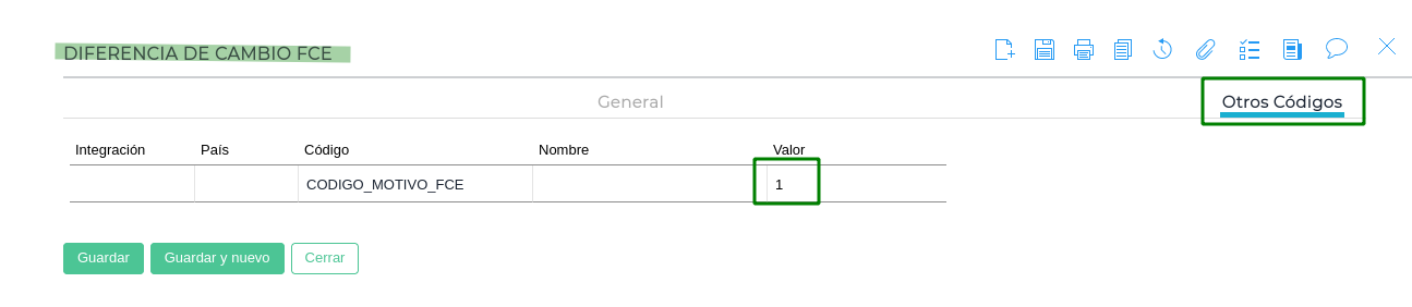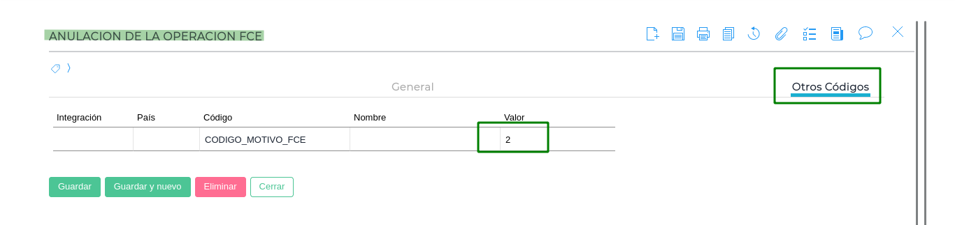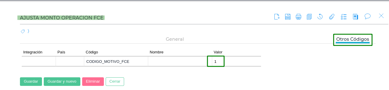 - Tener los motivos para generar Nota de Débito o Notas de Crédito por FCE. Luego en cada motivo configurar lo siguiente en el código adicional:
