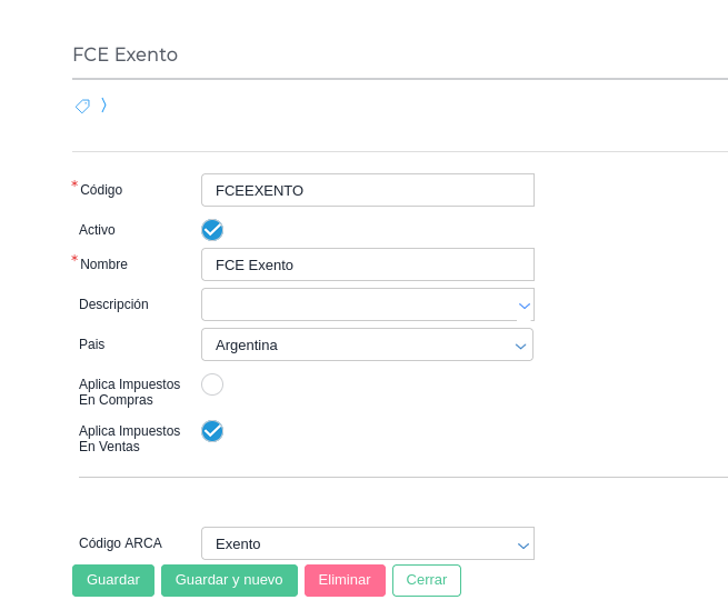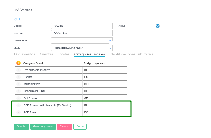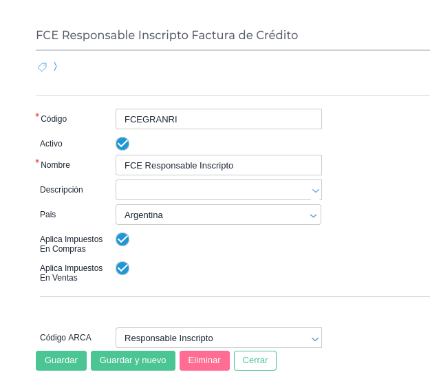 - Tener una categoría fiscal por cada tipo de contribuyente FCE que está en el padrón de FCE para responsables inscriptos y exentos. Los códigos impositivos para AFIP serán los mismos que tienen Responsable inscripto y exento. Es importante que pongas como códigos exactamente los mismos que detallamos a continuación: “FCEGRANRI” y “FCEEXENTO”. Es lo que utiliza el sistema para saber que son receptores de FCE.