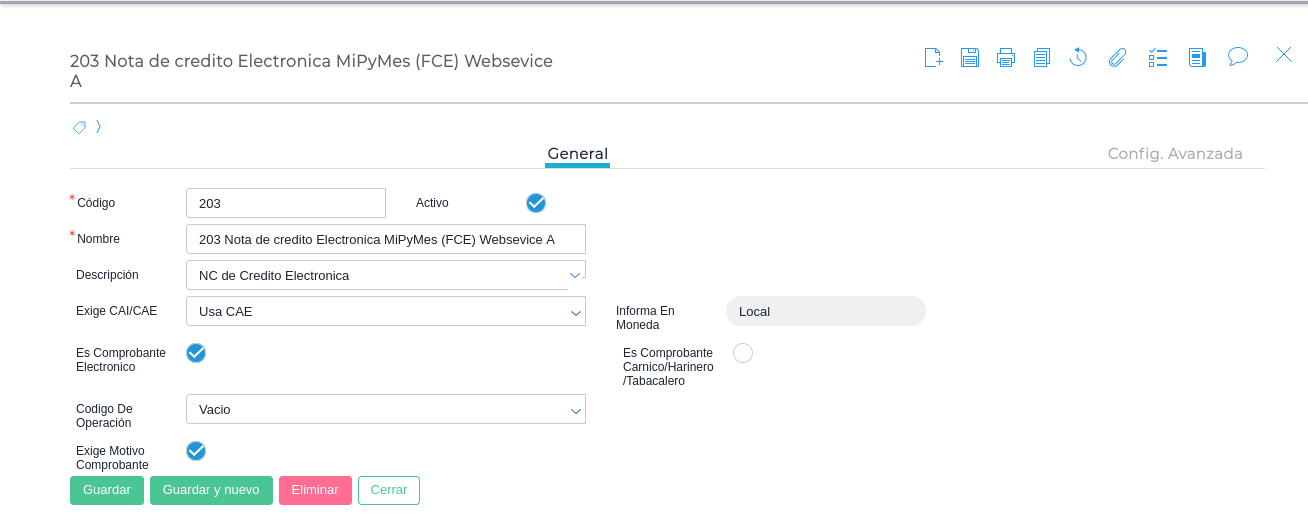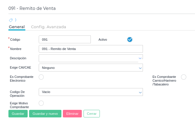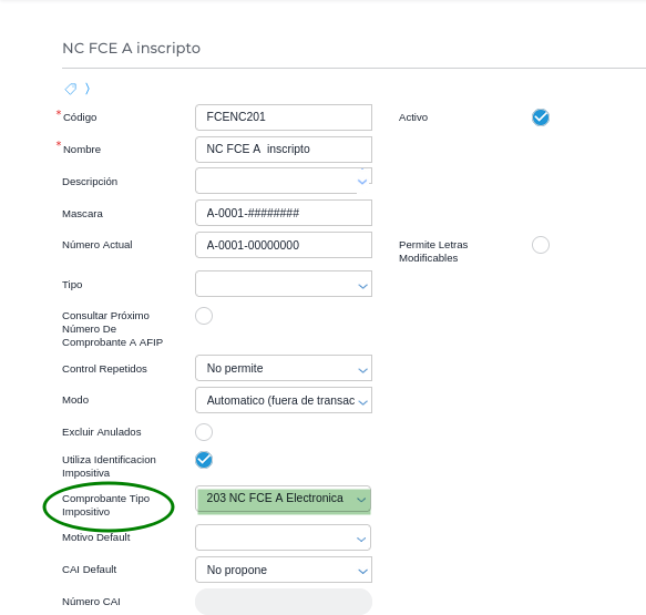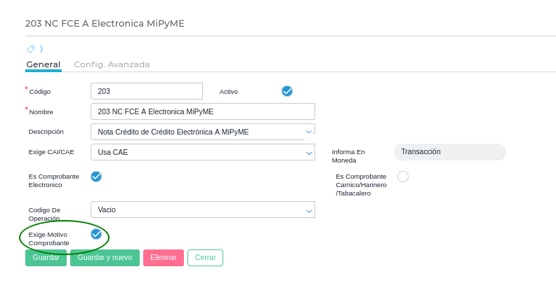 A su vez, el comprobante tipo impositivo debe tener tildado el check Exige motivo comprobante.