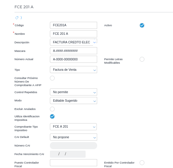 201 FACTURA DE CRÉDITO ELECTRÓNICA MiPyMEs (FCE) A: para el caso de categoría fiscal “inscripto factura de crédito” con comprobante tipo impositivo 201 (factura de crédito A)