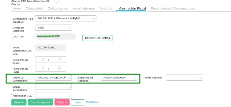 - Hacer la FCE Nota de Crédito de Ventas. En la solapa información fiscal, elegir el motivo. Seleccionar el que corresponda e indicar el comprobante asociado. Luego pedir el CAE.