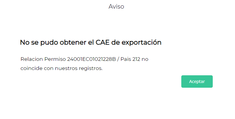Consulta: El sistema arroja el siguiente cartel de advertencia al momento de querer obtener CAE de una factura de exportación.