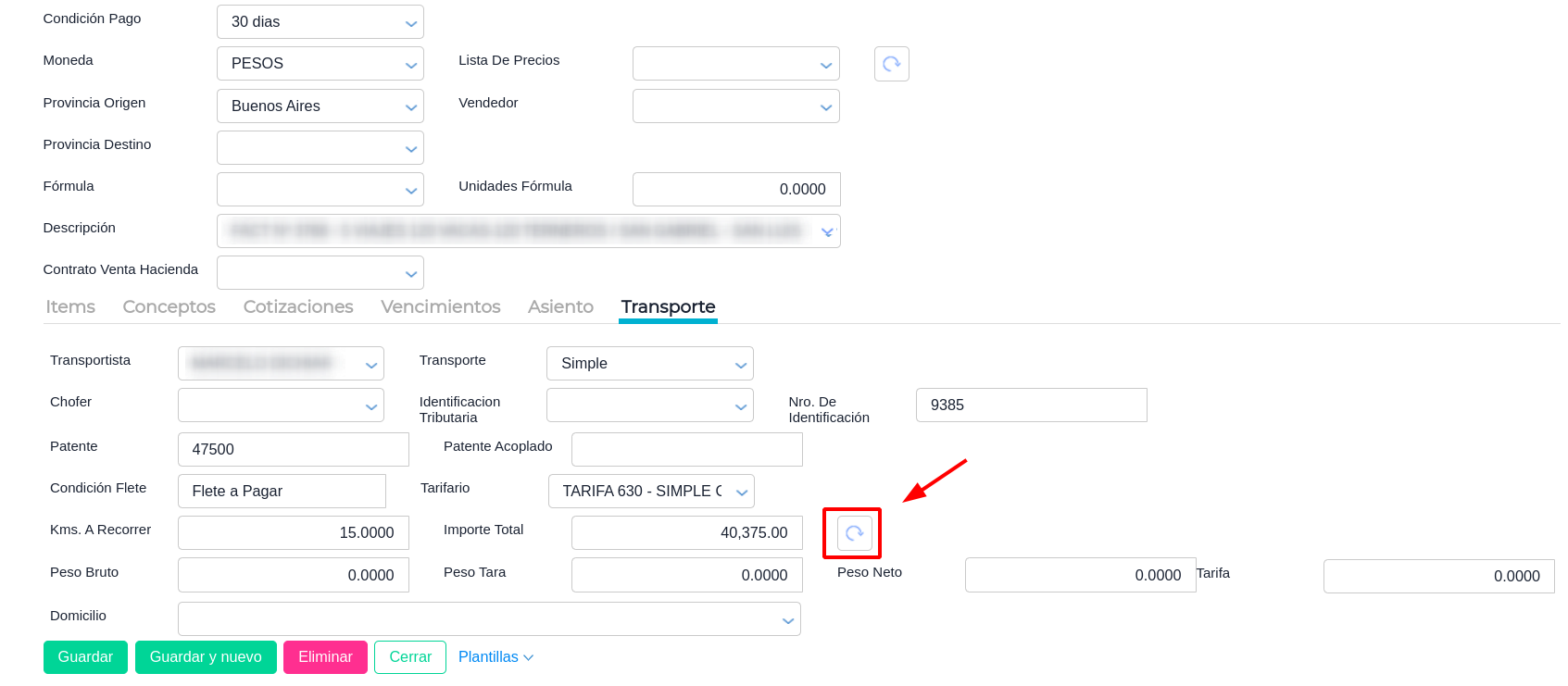 Al presionar refrescar en la solapa Transporte de una Factura de Venta aparece el aviso “java.lang.ArithmeticException”: