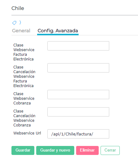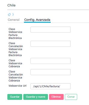 En el país Chile hay que completar /api/1/Chile/factura/ en el campo Webservice Url