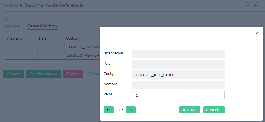 Luego, en el campo Código se completa con el valor correspondiente según la tabla.