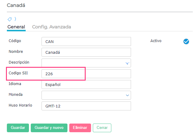 En el campo código SII completar el código según corresponda de acuerdo a la tabla.