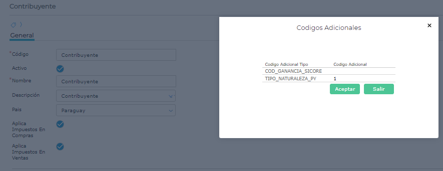 Completar el código adicional: TIPO_CONTRIBUYENTE_PY con los siguientes valores según corresponda: