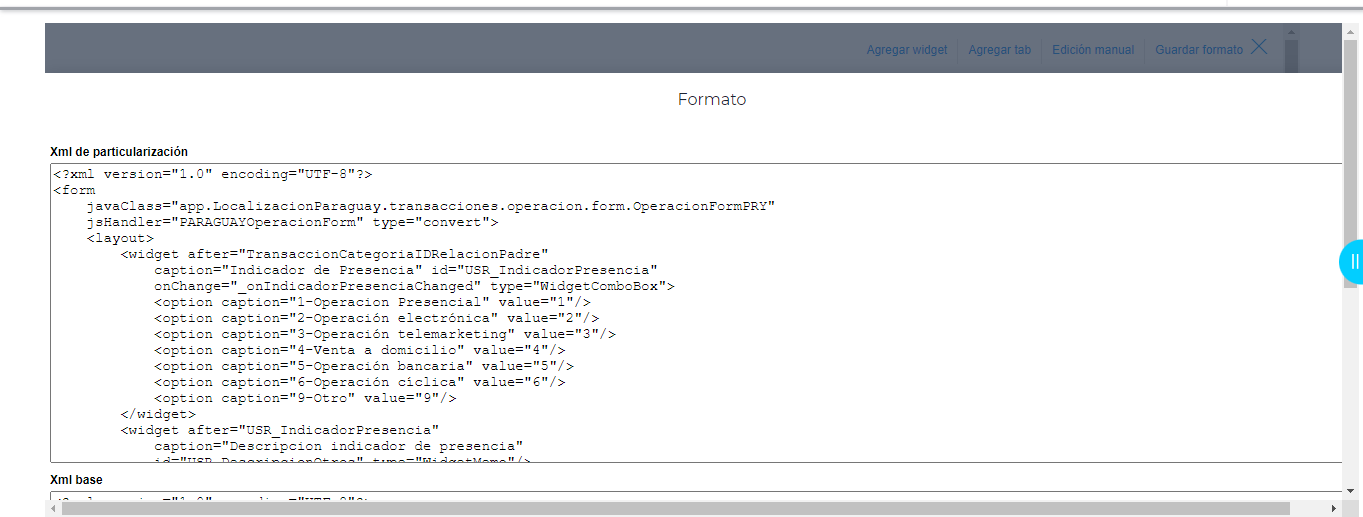 Para configurar el xml en transacciones, se debe ingresar y botón Formato → Edición Manual.