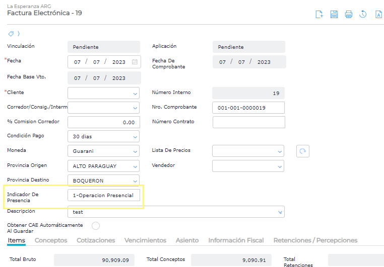 Completar el campo Indicador de presencia según corresponda: