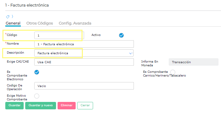 NOTA: La descripción del comprobante tipo impositivo DEBE ser igual a la descripción que se indica en la columna descripción