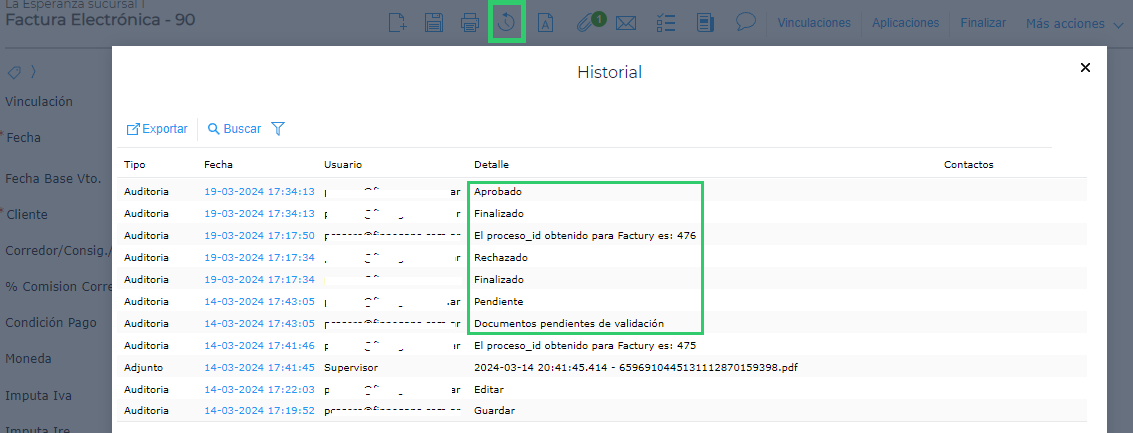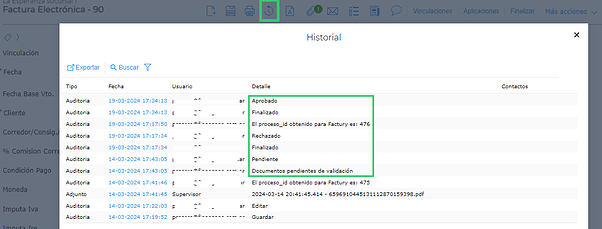 En el HISTORIAL de la transacción podrá verse la respuesta a la consulta de validación.