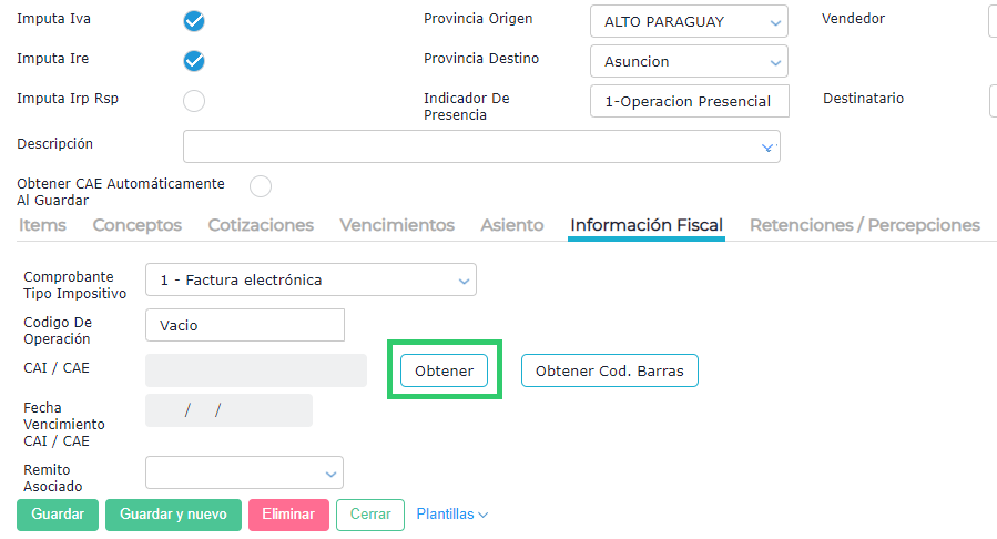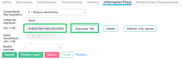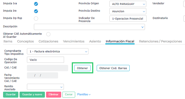 Una vez guardada la factura se accede a la pestaña información fiscal y se presiona el botón OBTENER