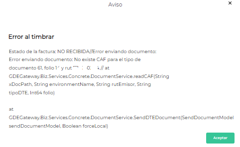 Al querer obtener cae de una factura de venta o una nota de crédito se emite el siguiente mensaje: