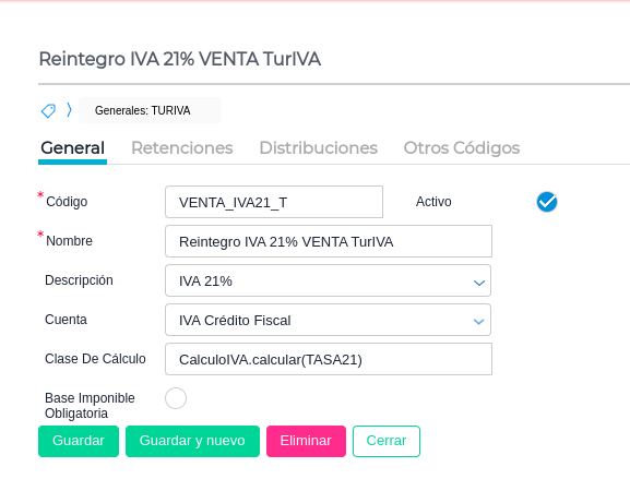 Nombre: Reintegro IVA 21% VENTA TurIVA