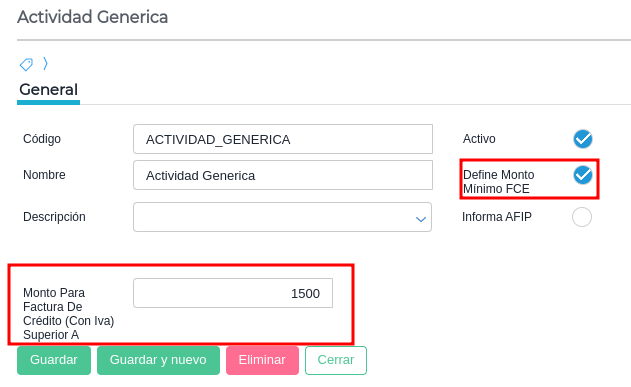 Dirigirse al maestro de "Actividades Afip” y para cada actividad tildar el check “Define Monto Mínimo para FCE” y completar el campo “Monto Para Factura de Crédito (Con Iva) Superior A” con el monto establecido por Afip para cuando corresponde facturar con un documento “Factura de crédito Electrónica”. Se pueden crear más actividades si es necesario.